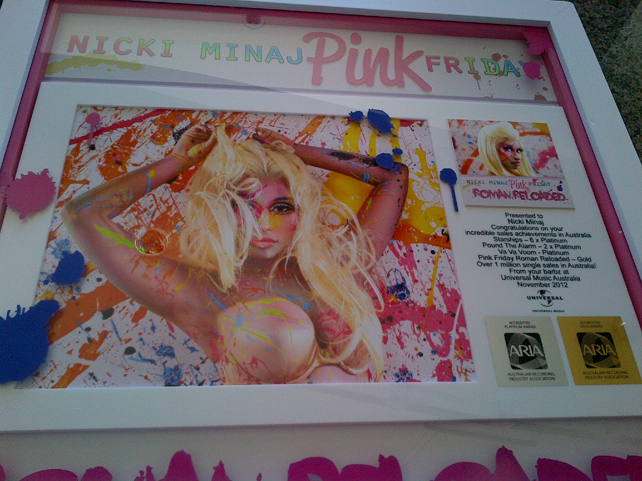 " Pink Friday : Roman Reloaded " באוסטרליה ולהשיג מעמד זהב! תוצאה יפיפיה! בנוסף לכך, זכתה במעמד פלטינה כפול 6 למכירותיו של Starships ( שהמכירות שלו רק הולכות וגדלות והוא הפך לשיר המצליח ביותר של ניקי בכל הקריירה ) Pound the alarm מכר בסכום של פלטינה כפול באוסטרליה ו- Va Va voom הגיע גם הוא למעמד פלטינה במכירות. כל הכבוד לניקי ושרק תצליח למכור עוד ועוד ובאלבום הבא תתעלה מעל כל המכירות ורק תצליח!